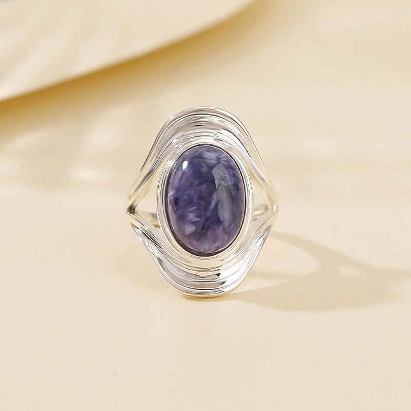 TerraDharma "Spiritual Awakening & Balance Restoration" Natural Oval Charoite Sterling Silver Ring (with Simple Design)
