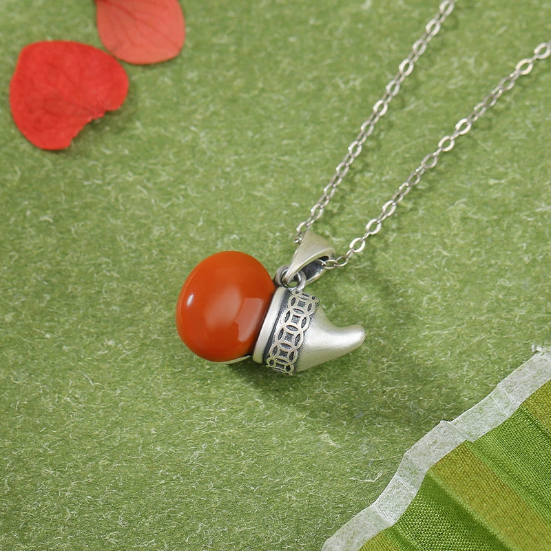 TerraDharma "Wealth-Grasping Luck & Peaceful Harmony" South Red Agate Gourd-shaped Pendant Nacklace (with Fu Pattern)