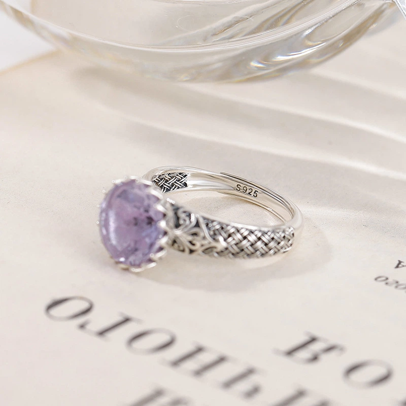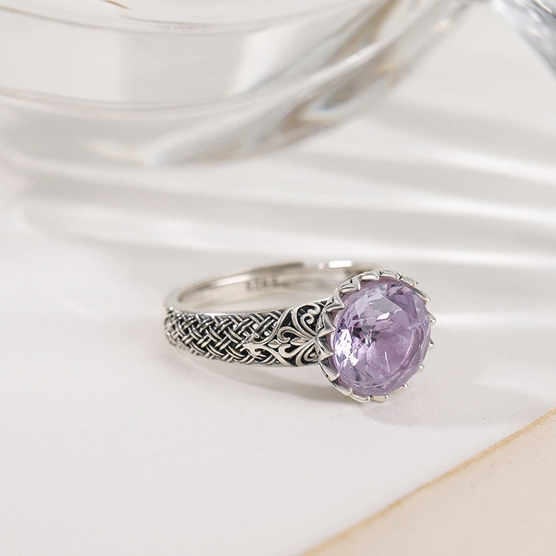 TerraDharma "Spiritual Awakening & Negativity Shield" Amethyst & Lotus - Engraved Silver Open Ring